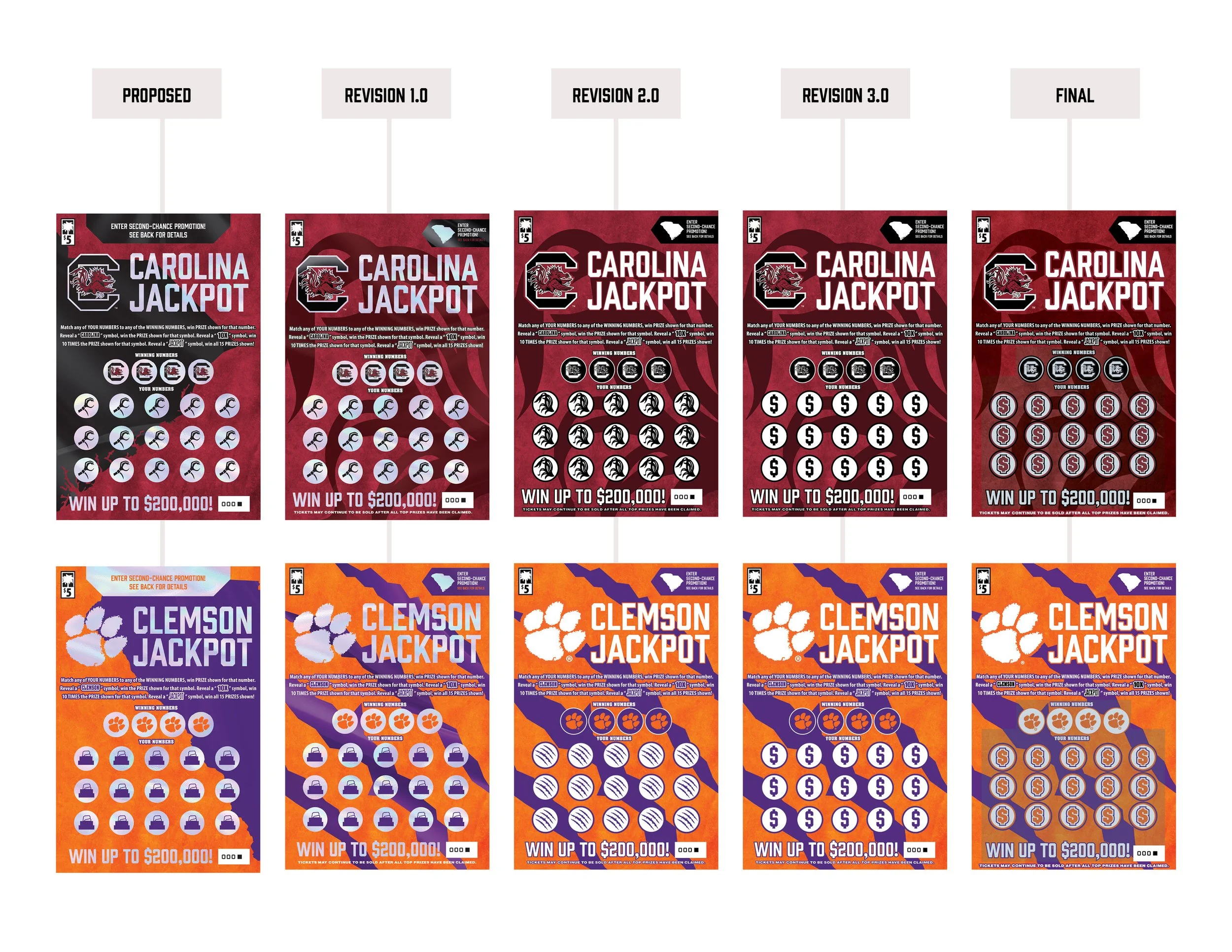 For the 2024, I created scratch off tickets to represent the University of South Carolina and Clemson University. I designed to reflect the unique look of each school, while still using the same design language with them. After passing along these tickets to the print manufacturer and commercial production group, these designs were used to print millions of tickets and were featured in a couple of region tv spots.